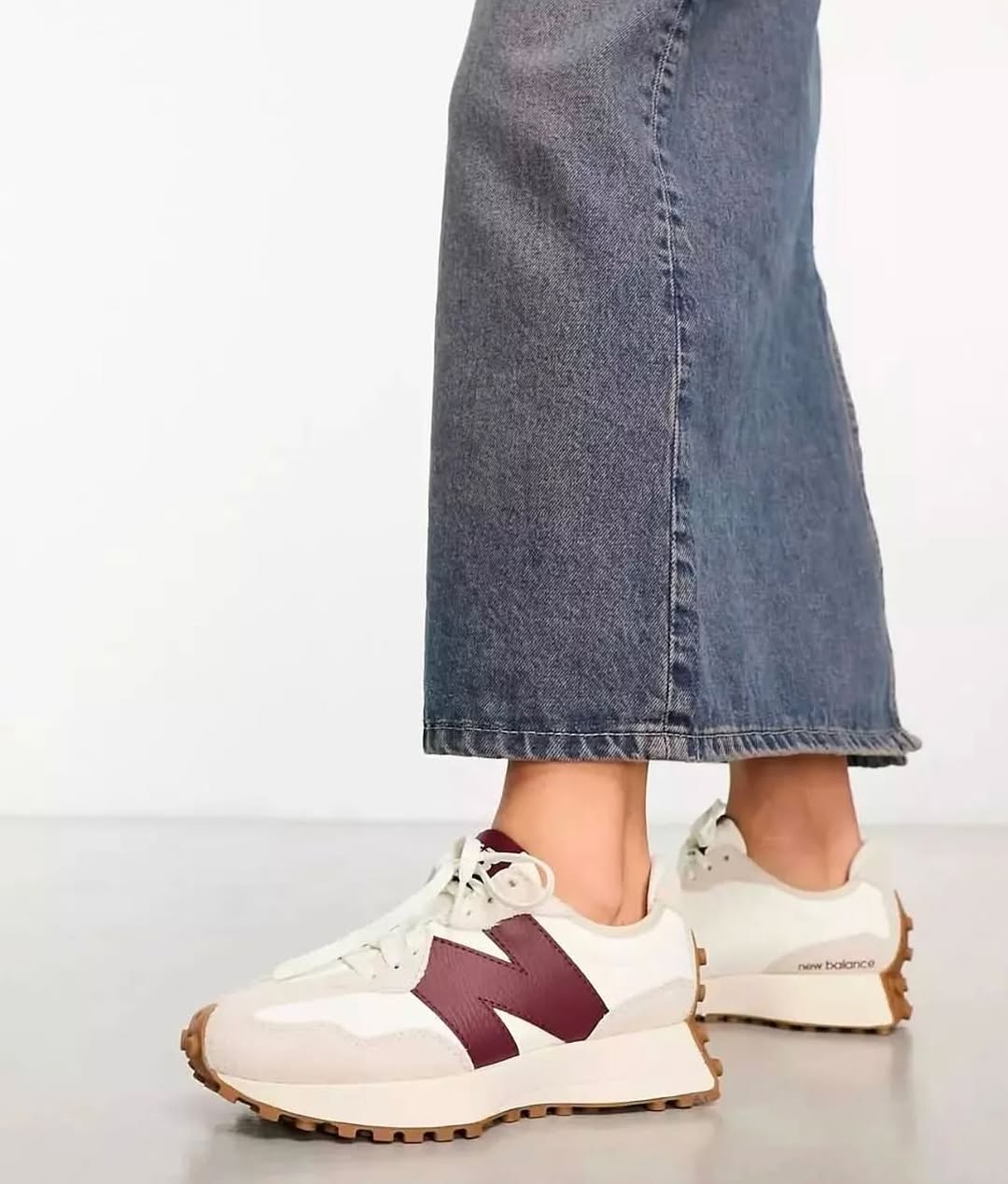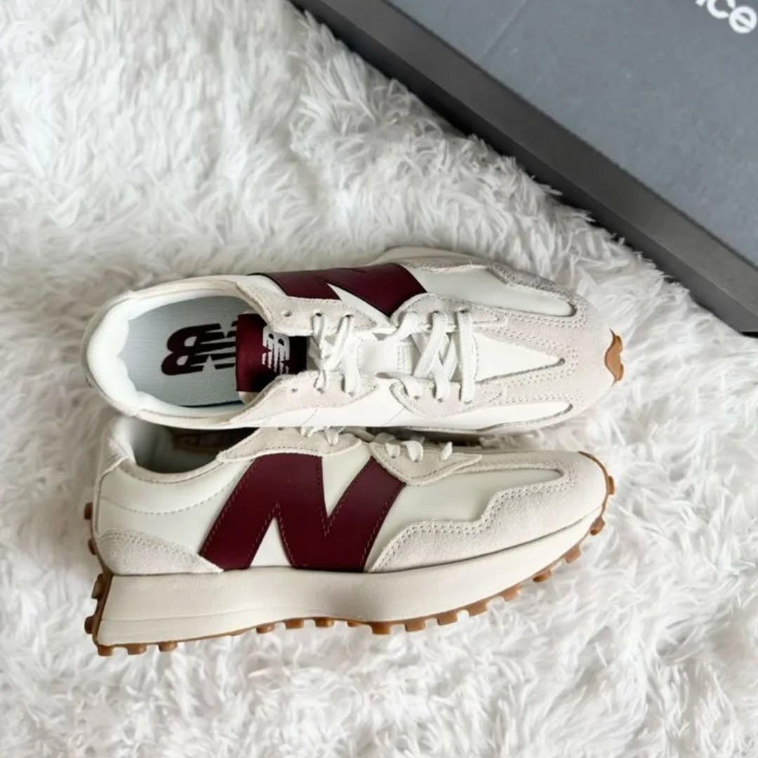 The New Balance 327 Moonbeam Classic Burgundy W arrives in a white, burgundy, and light gray color scheme.