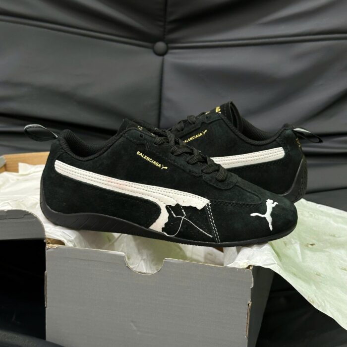 Co-branding with Balenciaga and Puma logos — Balenciaga in gold foil and Puma’s embroidered cat motif.